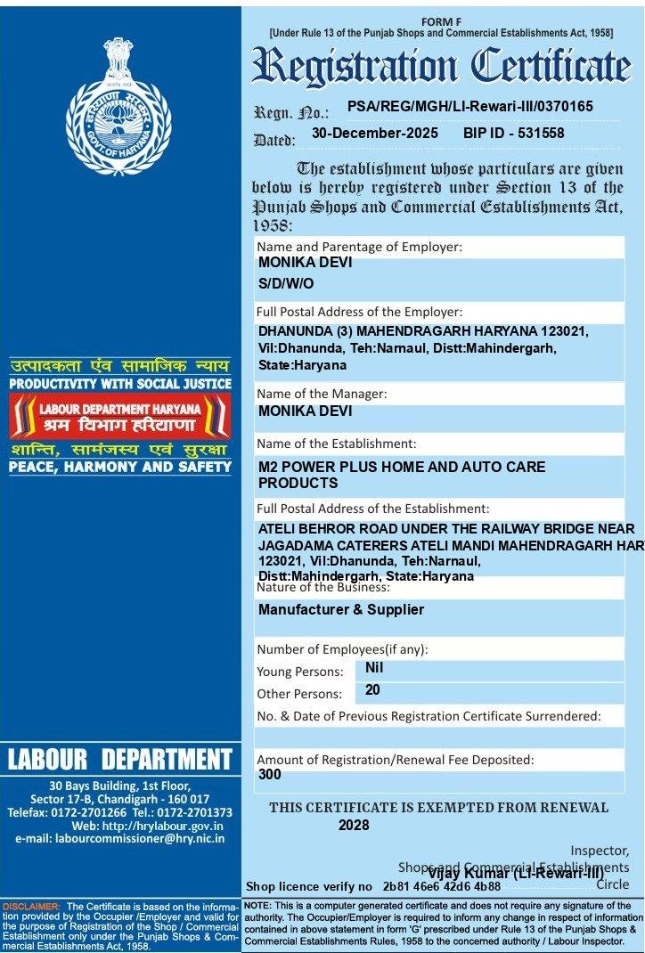 M2 Power Plus Home and Auto Care Products is a proud Indian manufacturer committed to delivering excellence in cleaning solutions. Founded and led by proprietor **Smt. Monika Devi**, we have established ourselves as a trusted name in the FMCG cleaning sector.